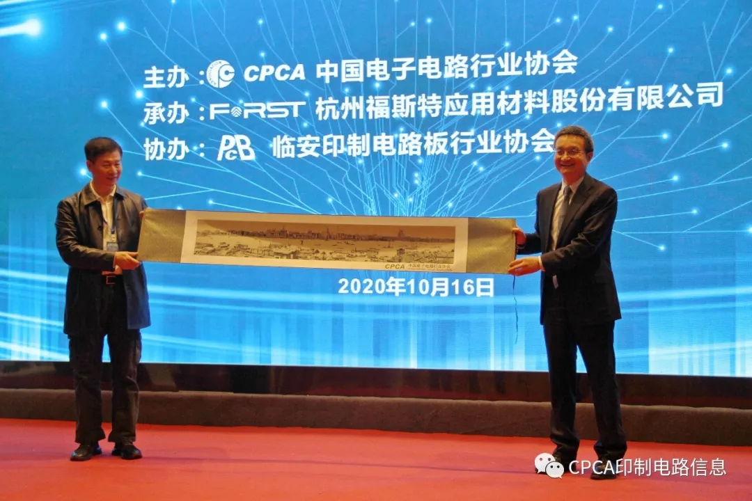感谢杭州福斯特对本次会议的鼎力支持和辛勤付出,CPCA科学技术委员会会长黄志东代表CPCA向本次年会的承办方杭州福斯特应用材料股份有限公司赠送礼品。