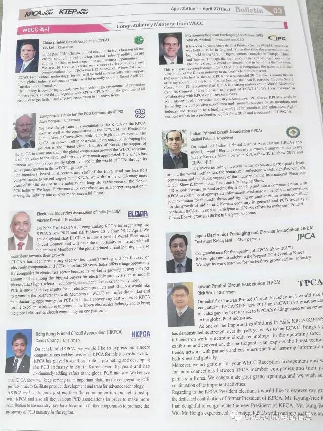 韩国国际电子电路产业展KPCA SHOW 2017于2017年4月25日~27日在韩国国际展览中心KINTEX举行。韩国国际电子组装产业展 KIEP SHOW 2017同期举办,CPCA张瑾秘书长与KPCA会长洪正峯及WECC各团体嘉宾一起参加了开幕剪彩。
