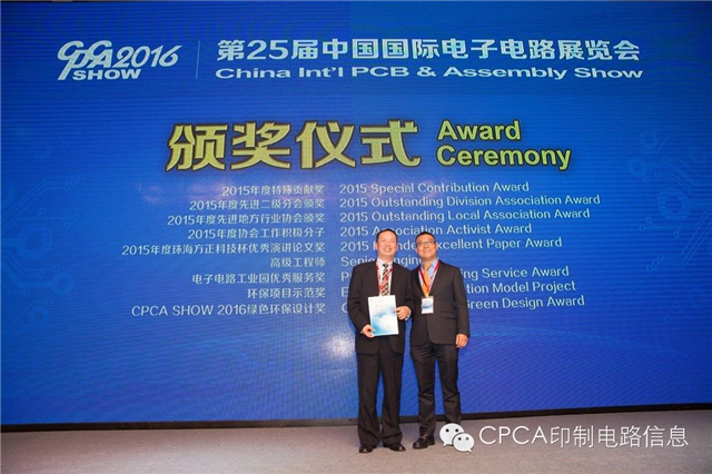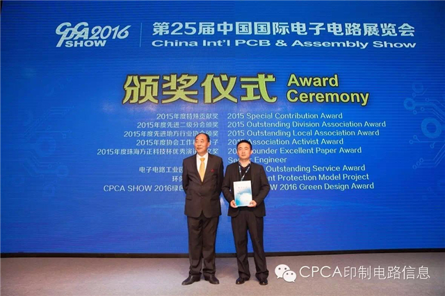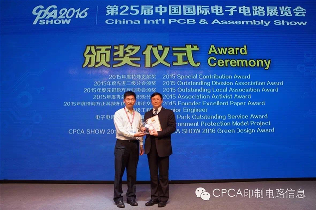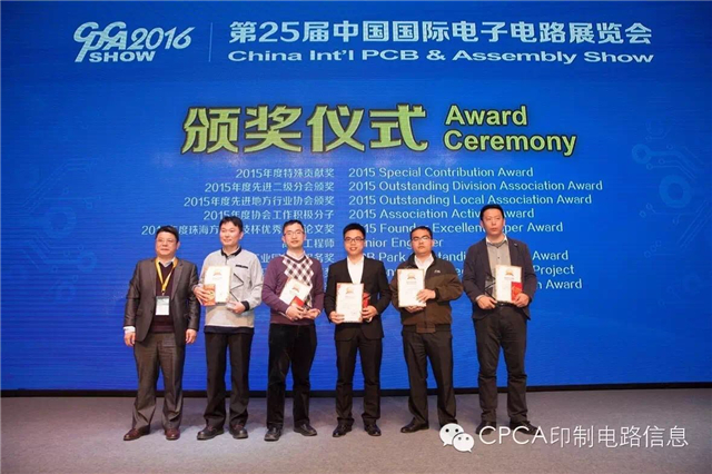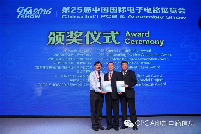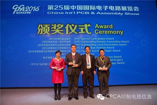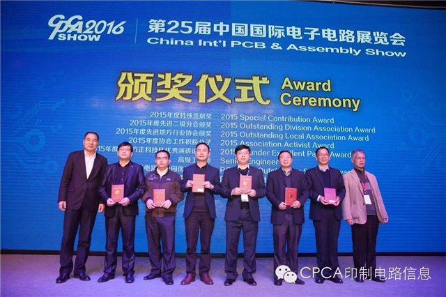 CPCA理事长由镭为2015年度特殊贡献奖获得者胜宏科技、方正科技、正业科技颁奖。