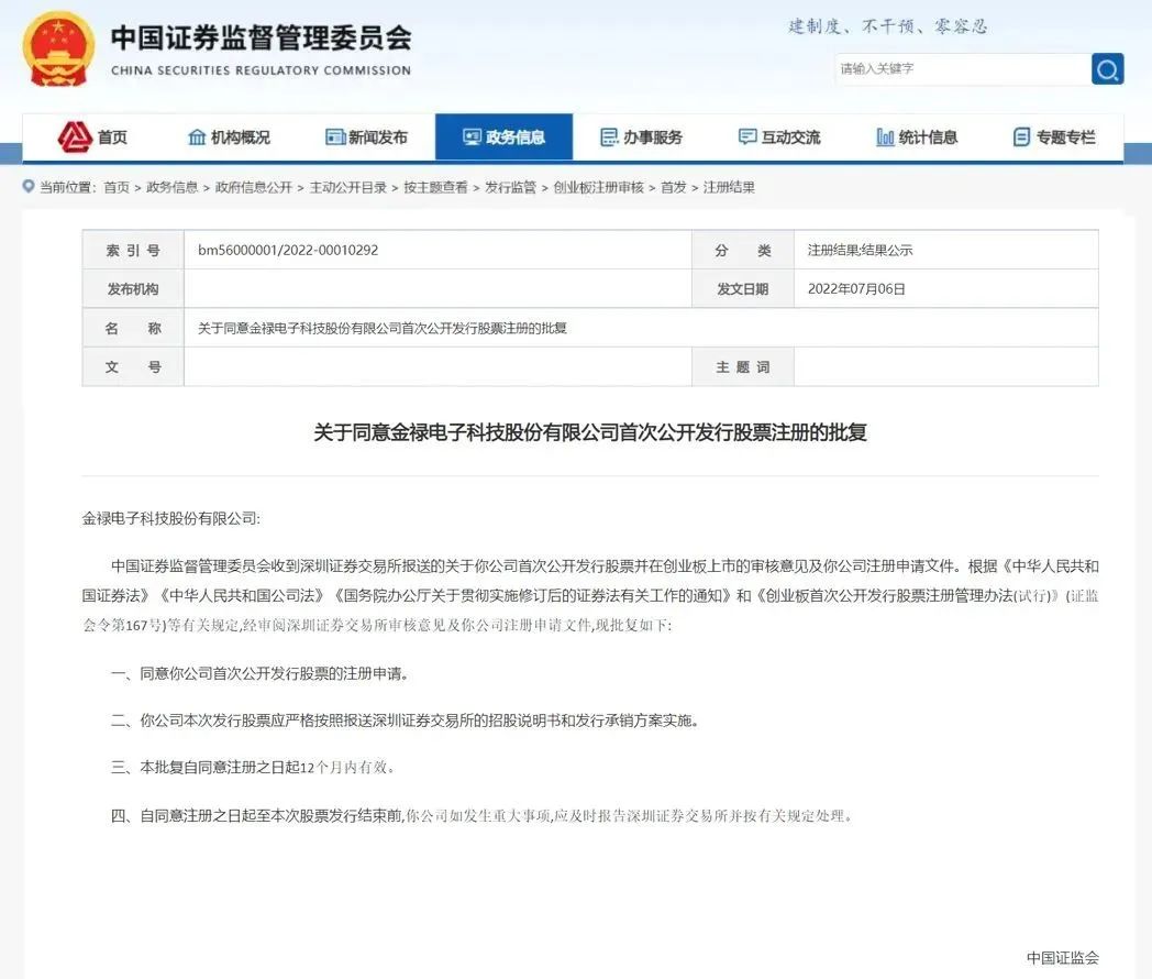 7月6日晚间,证监会披露了关于同意金禄电子科技股份有限公司(简称:金禄电子)首次公开发行股票注册的批复,同意金禄电子首次公开发行股票的注册申请。