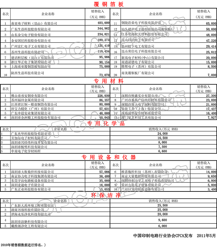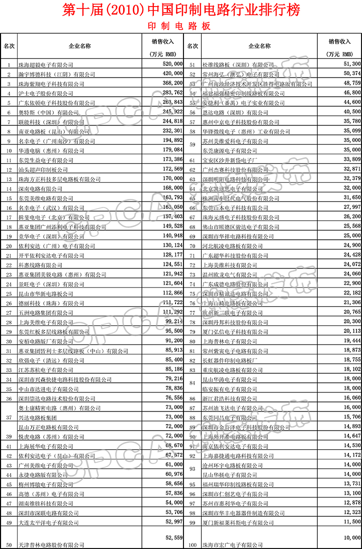 第十届(2010)中国印制电路行业排行榜
