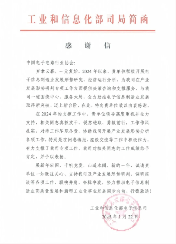 工业和信息化部电子信息司、上海交通大学向CPCA发来感谢信
