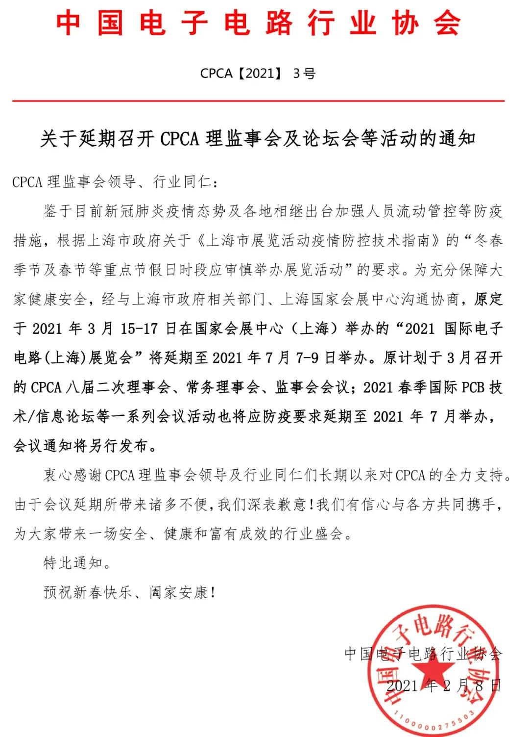 鉴于目前新冠肺炎疫情态势及各地相继出台加强人员流动管控等防疫措施,根据上海市政府关于《上海市展览活动疫情防控技术指南》的“冬春季节及春节等重点节假日时段应审慎举办展览活动”的要求。为充分保障大家健康安全,经与上海市政府相关部门、上海国家会展中心沟通协商,原定于2021年3月15-17日在国家会展中心(上海)举办的“2021 国际电子电路(上海)展览会”将延期至2021年7月7-9日举办。原计划于3月召开的CPCA八届二次理事会、常务理事会、监事会会议;2021春季国际PCB技术/信息论坛等一系列会议活动也将应防疫要求延期至2021年7月举办,会议通知将另行发布。