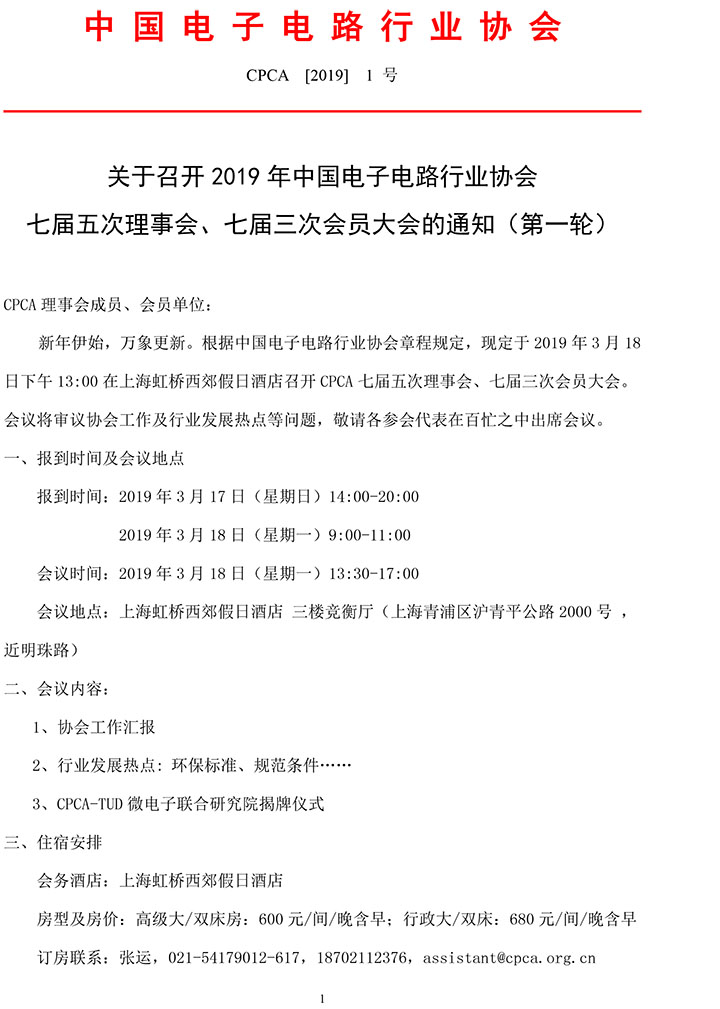 关于召开 2019年中国电子电路行业协会 七届五次理事会、七届三次会员大会的通知(第一轮)