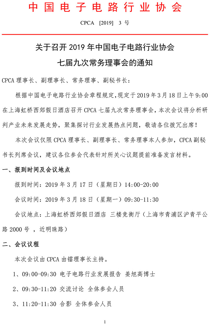 关于召开 2019年中国电子电路行业协会 七届九次常务理事会的通知