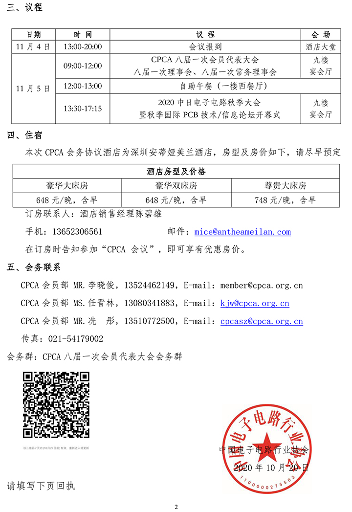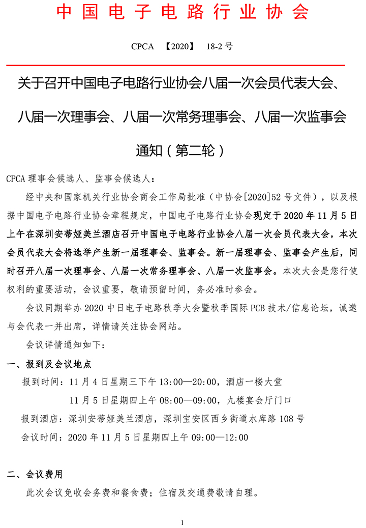 关于召开中国电子电路行业协会八届一次会员代表大会、 八届一次理事会、八届一次常务理事会、八届一次监事会 通知(第二轮)