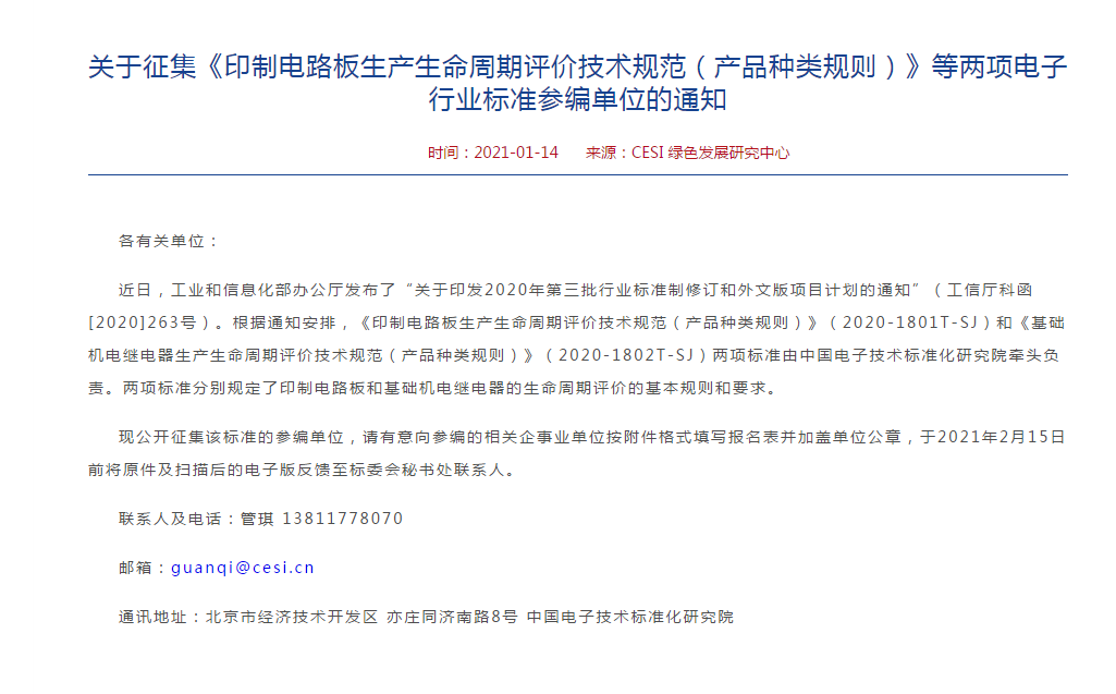 关于征集《印制电路板生产生命周期评价技术规范(产品种类规则)》等两项电子行业标准参编单位的通知