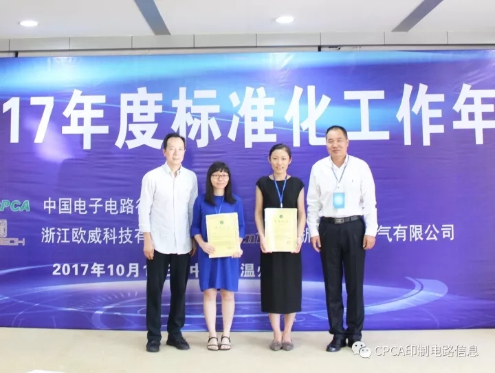 本年度(2017年度)共完成标准2项,正在进行的标准有6项(国家参编标准1项、CPCA修订标准2个、CPCA标准2个)、新立项标准2项;其次,标委会2017年新增4位委员,分别是欣强电子(清远)有限公司雷红慧、珠海镇东陈翠、临安鹏宇朱晓东、华为终端孙睿。现有领导小组成员7名,委员72名,总计79名。鉴于中国印制电路行业协会已于2017年3月正式更名为“中国电子电路行业协会”,由CPCA名誉秘书长王龙基、CPCA秘书长张瑾、CPCA标委会主任朱民、CPCA标委会副主任王成勇、原CPCA标委会会长陈文录及此次标委会工作会议承办方浙江欧珑电气、欧威科技董事长张方德一起向各位委员颁发了新的聘书。