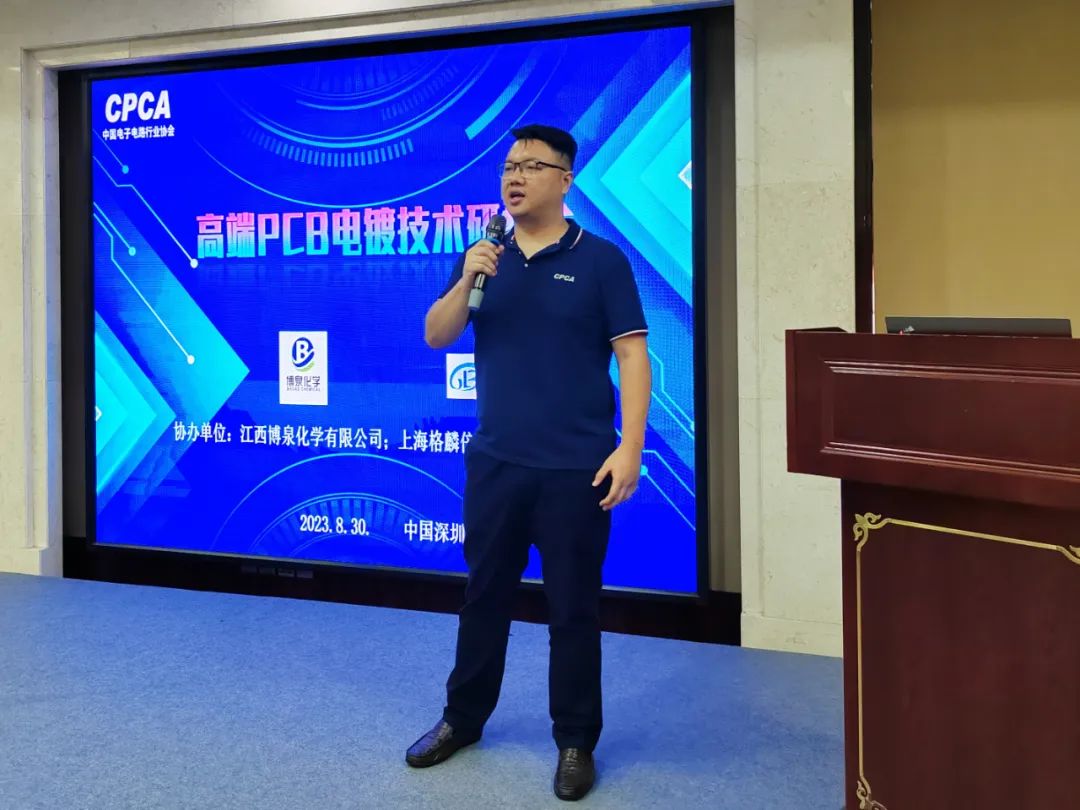 随着当下人工智能(AI)行业高速发展,令应用在AI服务器上的高价值量PCB产品市场需求大幅提升。AI服务器芯片升级,PCB也需相应地进行升级,不仅层数提升,而且板厚更厚,表面线路布局更密,对于PCB电镀提出更高技术要求。基于此背景下,2023年8月30日,由中国电子电路行业协会CPCA主办,江西博泉化学有限公司与上海格麟倍信息科技有限公司协办的“高端PCB电镀技术研讨会”在广东省深圳市宝安区皇家维纳斯酒店维也纳厅召开。本次研讨会由CPCA副秘书长冼彤、培训部章瑜互主持。本次研讨的主题围绕封装载板镀铜技术国产化、高厚径比板电镀技术…