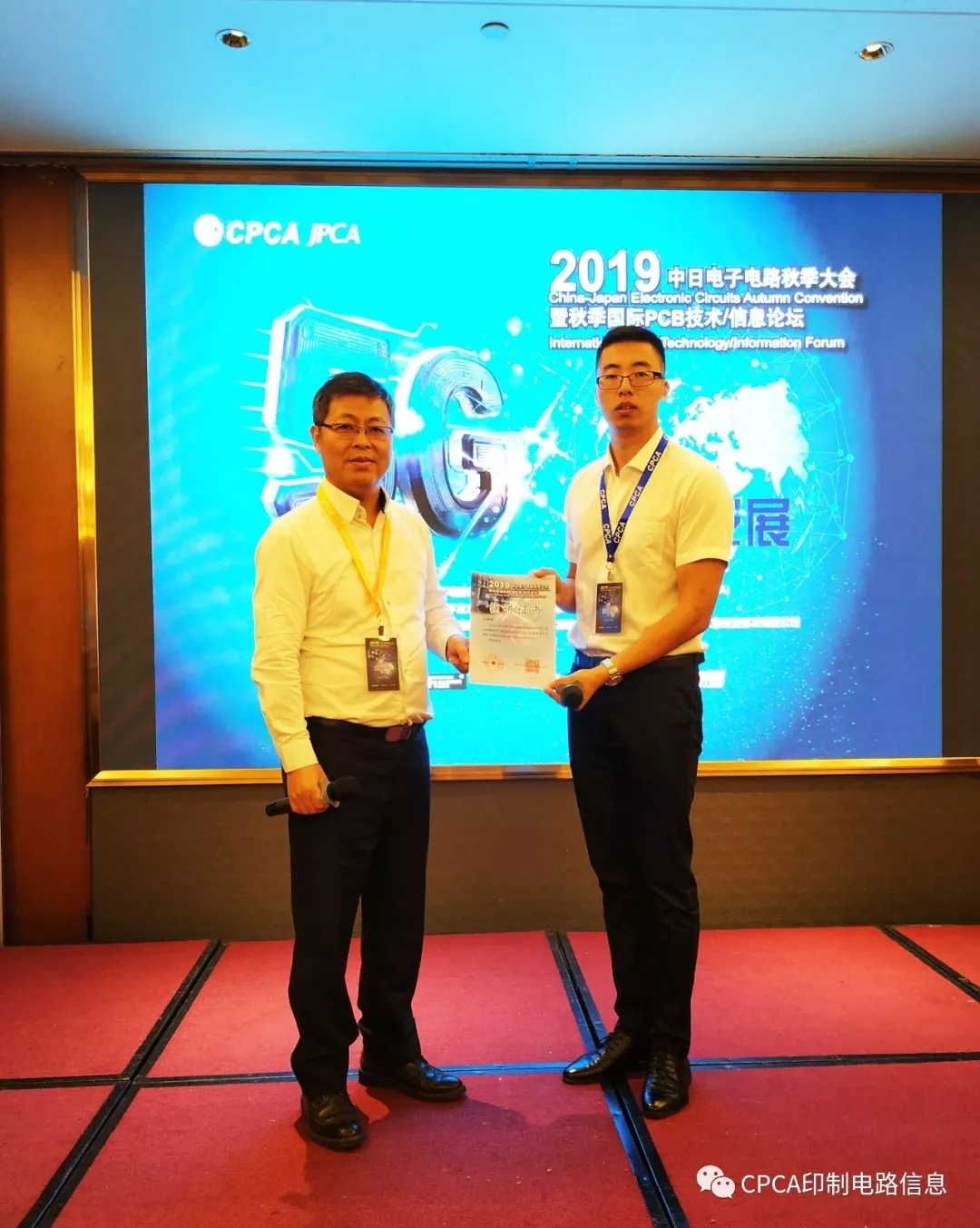 主持人李志东向获选入2019秋季论文集的广东正业科技股份有限公司吴鹏辉颁发证书。