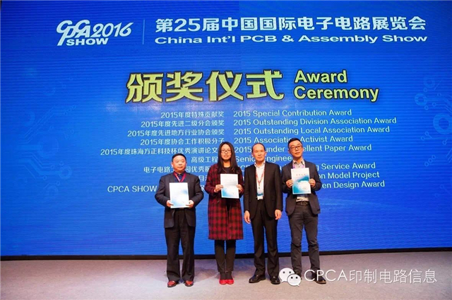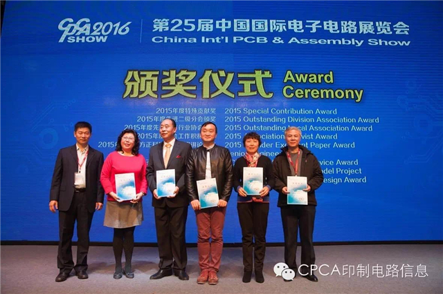 CPCA理事长由镭为2015年度特殊贡献奖获得者胜宏科技、方正科技、正业科技颁奖。