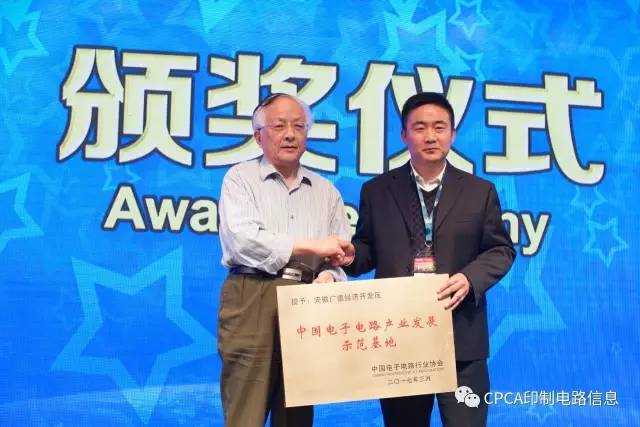 CPCA顾问何为为中国电子电路行业优秀服务园区得住四川遂宁PCB园区颁奖。