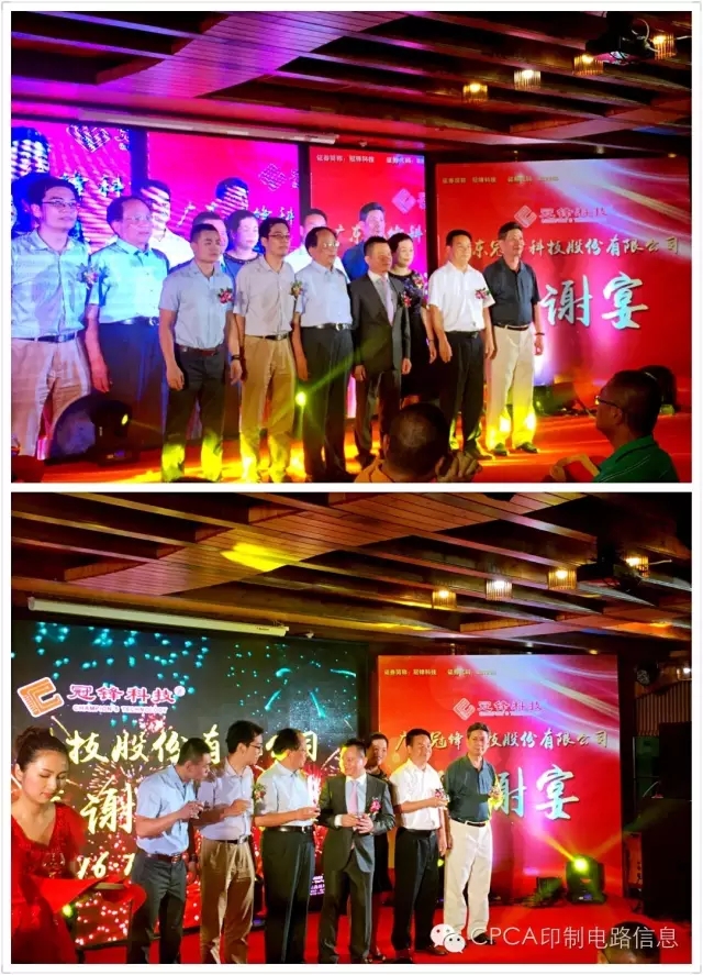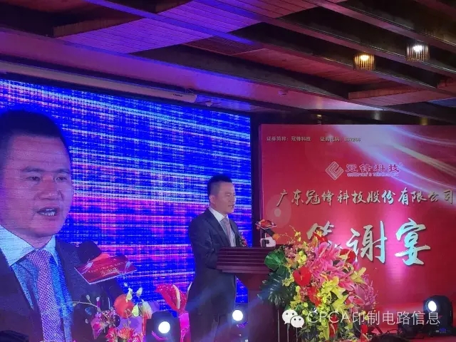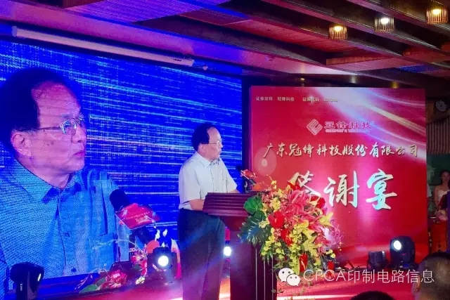 CPCA名誉秘书长王龙基在致词中讲到"人杰地灵的梅州,山青青、水秀秀、天蓝蓝,梅江河畔的风景如画。当前,在经济下行压力不断加大的情况下, 今年五月初,冠锋公司获准在“新三板”挂牌,成为梅州市印制电路板行业第一家、梅江区第三家在“新三板”挂牌的企业,纯属不易。这是冠峰公司和林能文董事长的喜庆,这是梅州印制电路行业协会的喜庆,这也是中国印制电路行业协会CPCA,即将更名为中国电子电路行业协会CPCA的喜庆!企业需要努力!中国电子电路行业的同仁们必须齐心继续奋斗!把我们伟大祖国的电子电路行业推向世界强盛!"冠锋公司的上市,告诉我们:无论企业规模大小、无论企业创业长短、无论生产什么产品,只要我们不懈坚持,就一定可以成为知名的、强盛的民族企业!