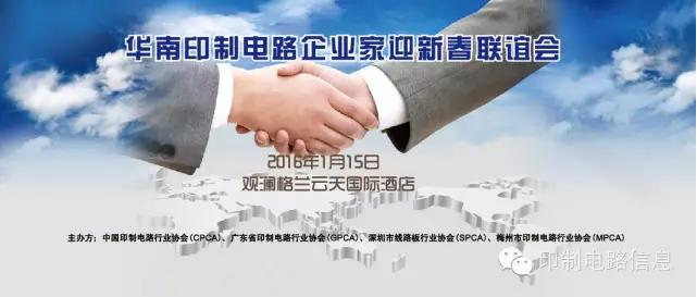2016年1月15日,中国印制电路行业协会(CPCA)协同广东省印制电路行业协会(GPCA)、深圳市线路板行业协会(SPCA)、梅州市印制电路行业协会(MPCA)携手在深圳观澜格兰云天国际酒店隆重举办华南PCB企业家迎新春联谊会。