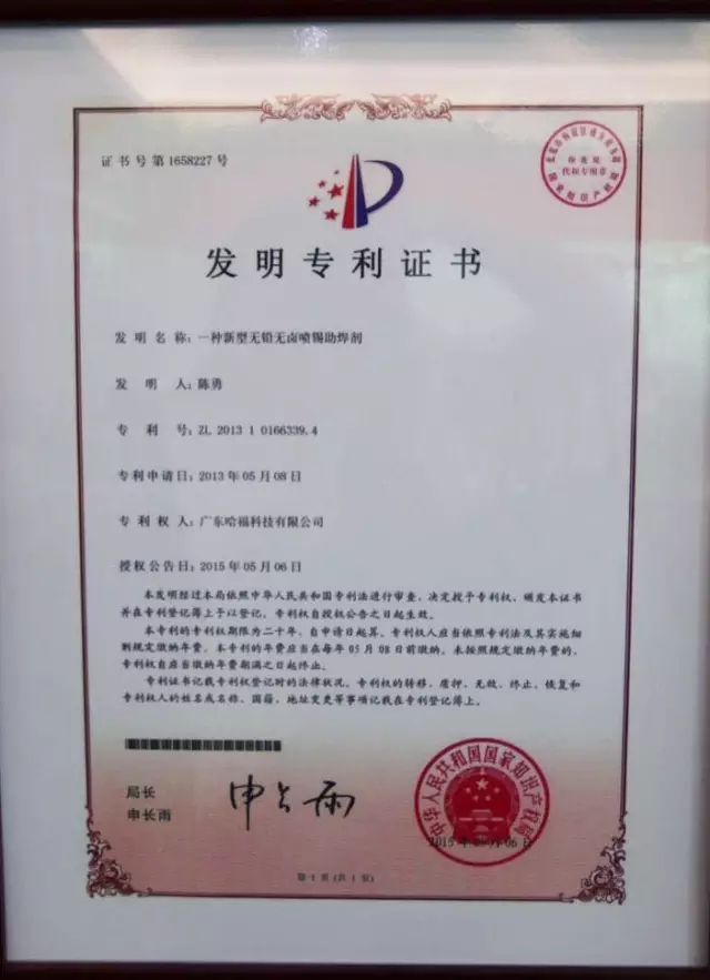 在哈福研究院的办公室里,陈董指着“一种新型无铅无卤喷锡助焊剂”的发明专利告诉我们,该项专项已获得政府100万元的项目扶持。这项专利的发明人正是陈勇本人。