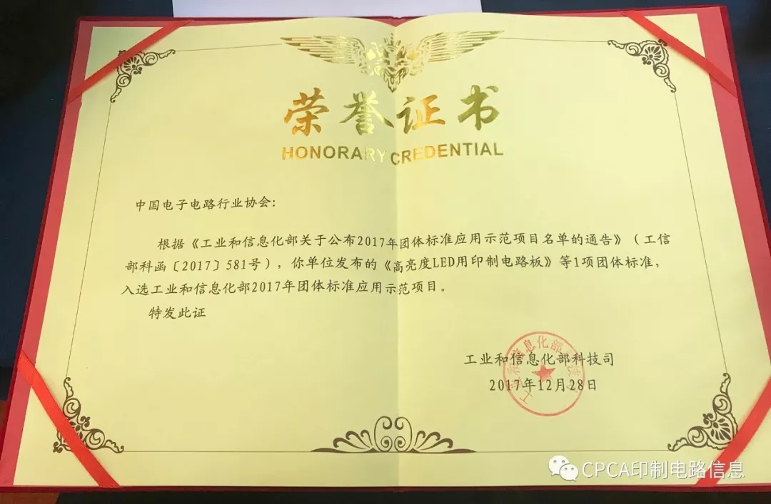 CPCA标准 T/CPCA 6041-2014《高亮度LED用印制电路板》(由中国电子电路行业协会编制,珠海方正印刷电路板发展有限公司担任项目组长单位),鉴于其技术的创新性,入选首批工业和信息化部“百项团体标准应用示范项目”。