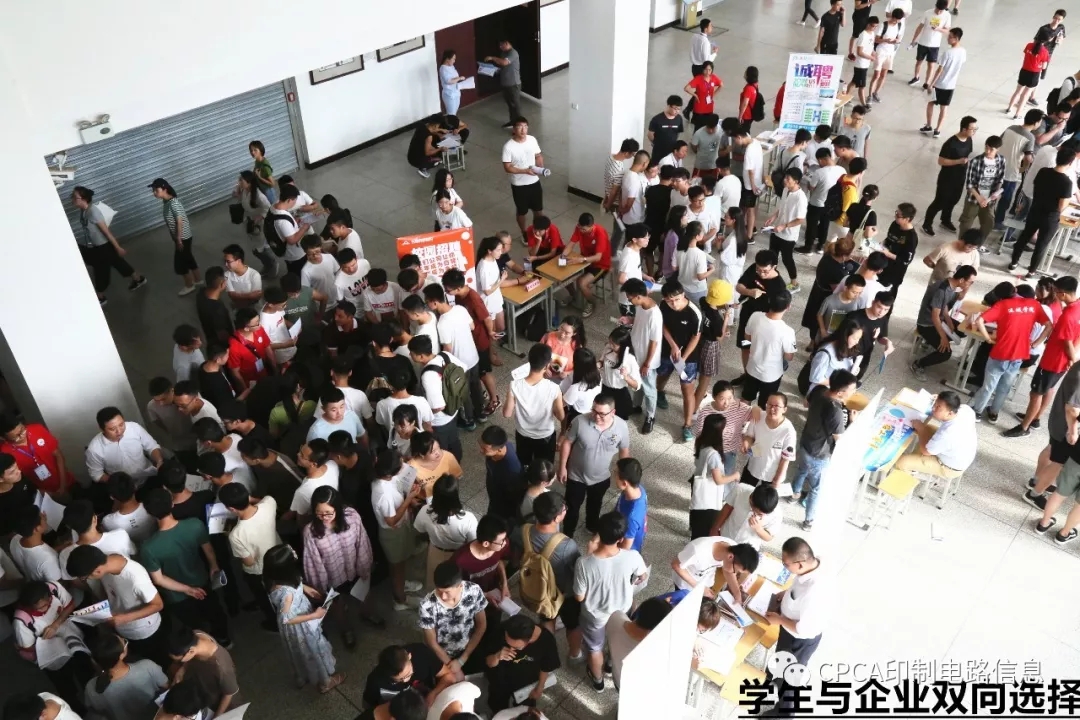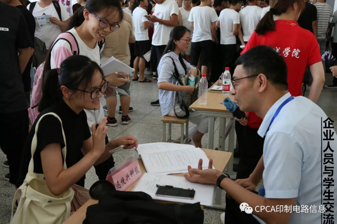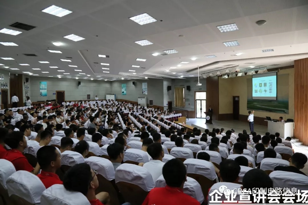 校领导、协会和电子科大周国云教授和十六个企业招生代表合影后,王龙基为342名学生做了电子电路的报告。有17家企业参加并为电子电路专业学生提供463个实习就业岗位。这次前来参加洽谈会的企业有中国电子电路行业协会理事长单位:深南电路股份有限公司;副理事长单位:博敏电子股份有限公司、惠州中京电子科技有限公司、恩达电路(深圳)有限公司、东莞市五株电子科技有限公司、昆山华新电子集团有限公司、台山市精诚达电路有限公司、方正电路板;常务理事单位:盐城维信电子有限公司、奈电软性科技电子(珠海)有限公司、东莞康源电子有限公司、上海嘉捷通电路科技股份有限公司、浙江君浩电子股份有限公司、昆山鼎鑫电子有限公司、苏州群策科技有限公司;还有会员单位深圳市迅捷兴科技股份有限公司和昌硕科技(上海)有限公司。其中上市公司 11家。华南企业10家占比58.8%,华东企业7家占比41.2%。