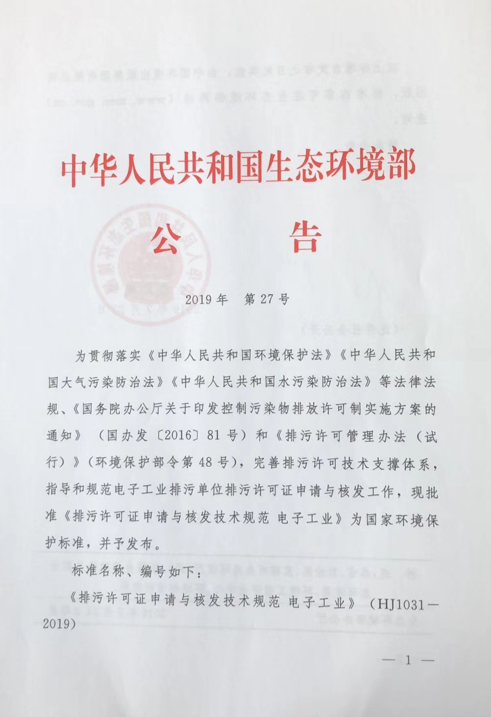 为贯彻落实《中华人民共和国环境保护法》、《中华人民共和国大气污染防治法》、《中华人民共和国水污染防治法》等法律法规,根据中华人民共和国生态环境部2019年7月24日印发的2019年第27号公告,现批准《排污许可证申请与核发技术规范电子工业》(HJ 1031-2019)为国家环境保护标准,予以发布。