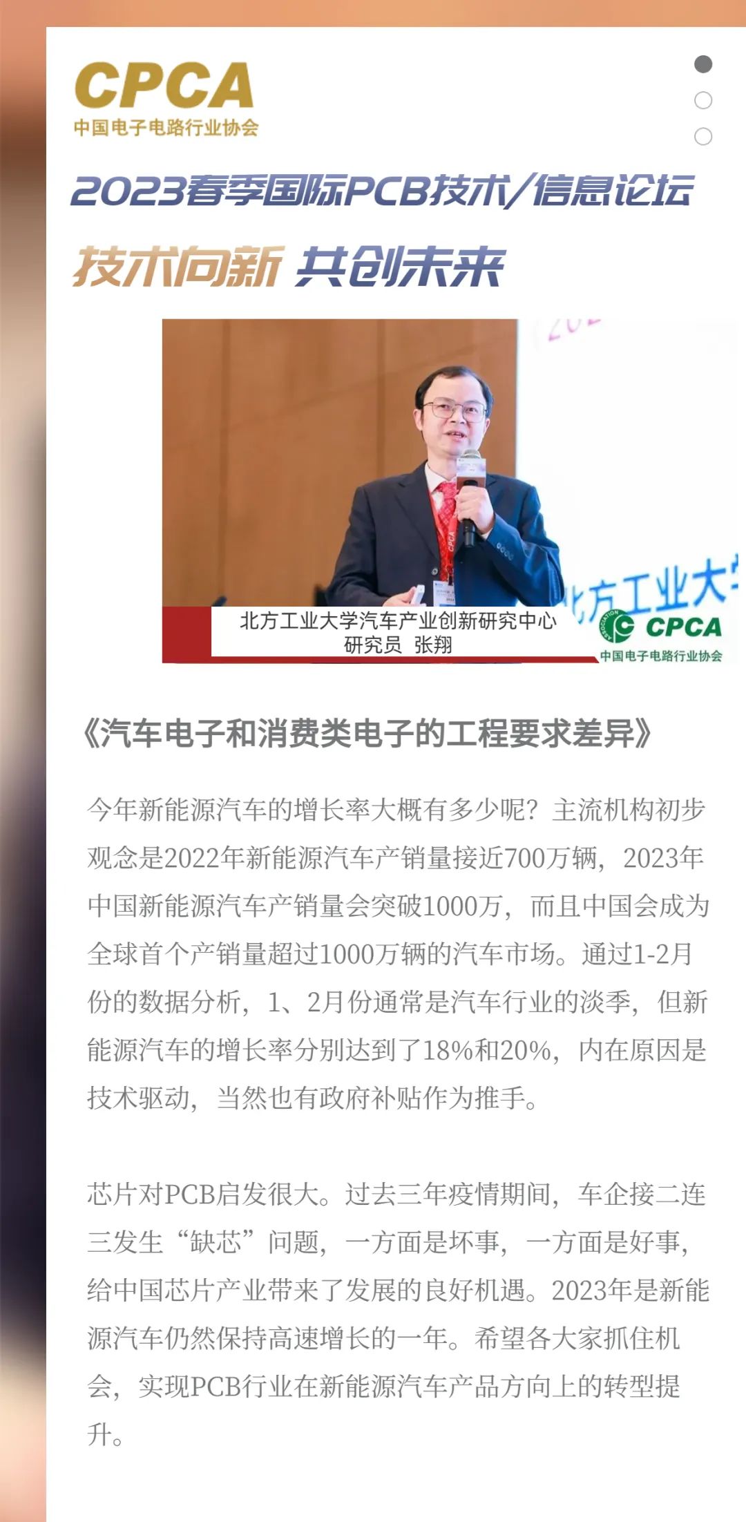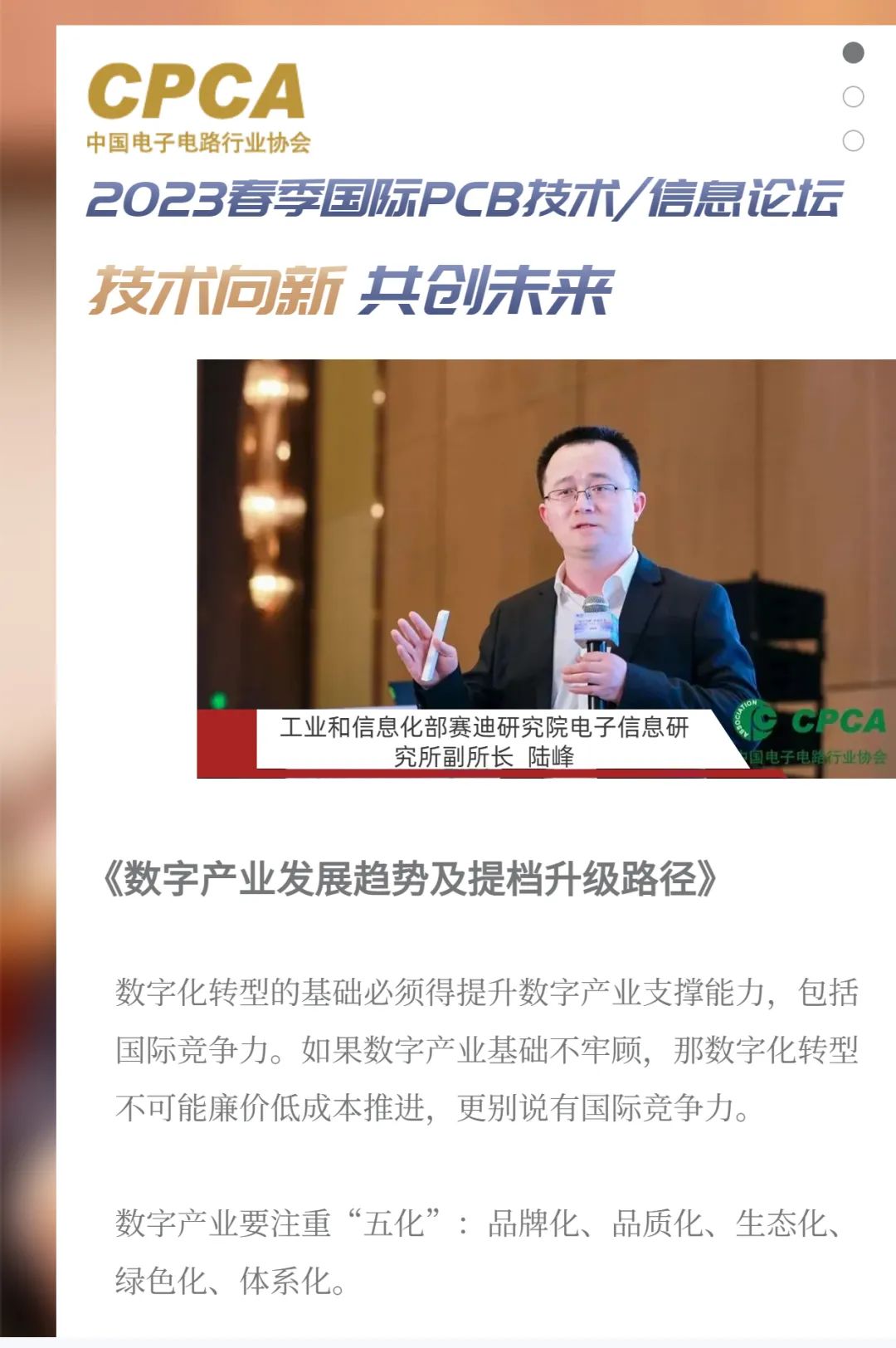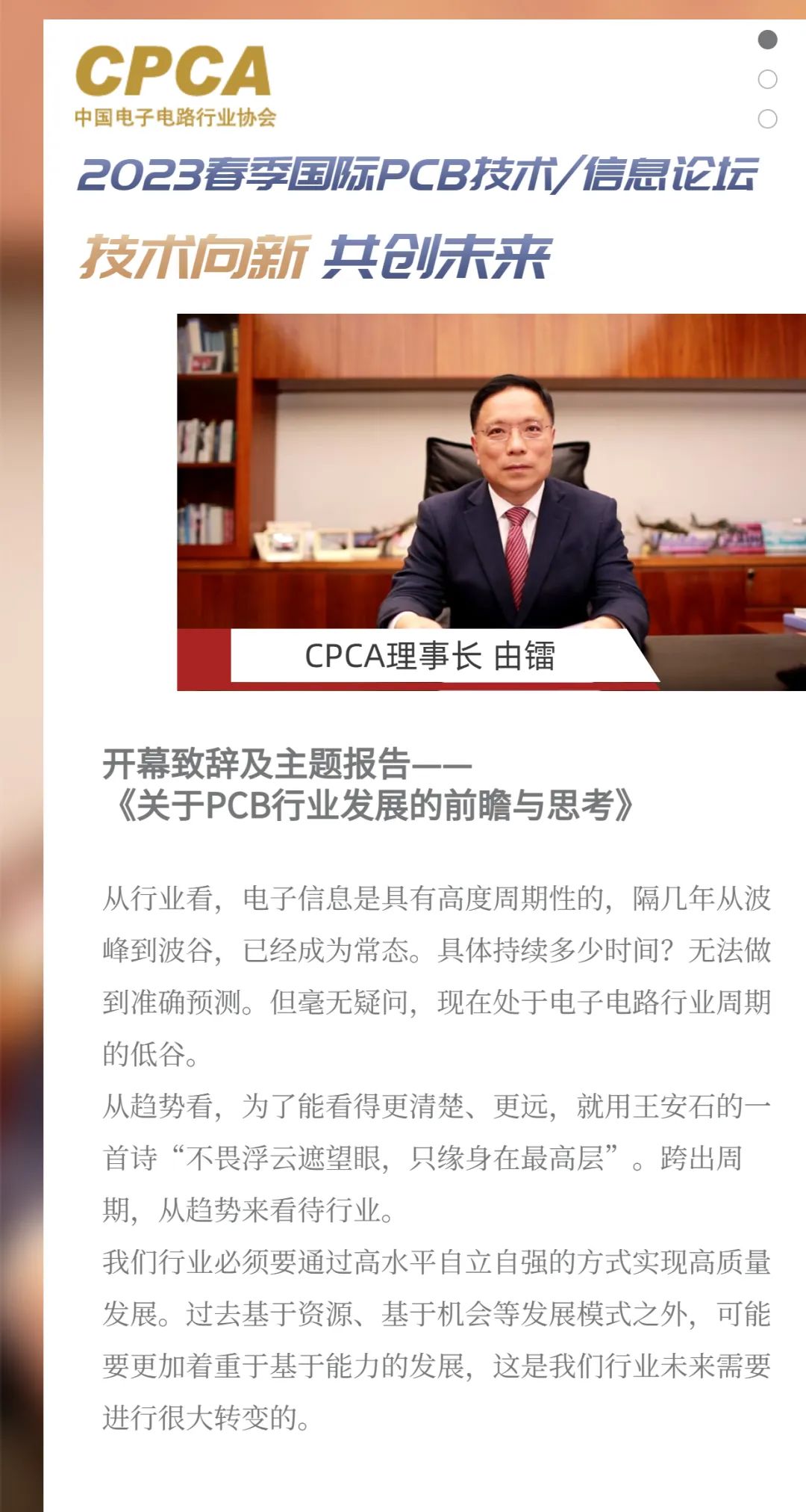 由中国电子电路行业协会CPCA发起的对话平台“CPCA会客厅”。平台设定聚焦产业发展趋势、重点和难点问题,目标开展一系列高端对话,为国内外行业专家、企业的创新产品及技术、建立交流的平台,凝共识、展新势,向国内外传播中国电子电路行业发展的趋势和规律。为积极稳妥推进行业高质量发展出谋划策。平台的特色:聚焦创新热点,探讨产业发展,汇集行业智慧。