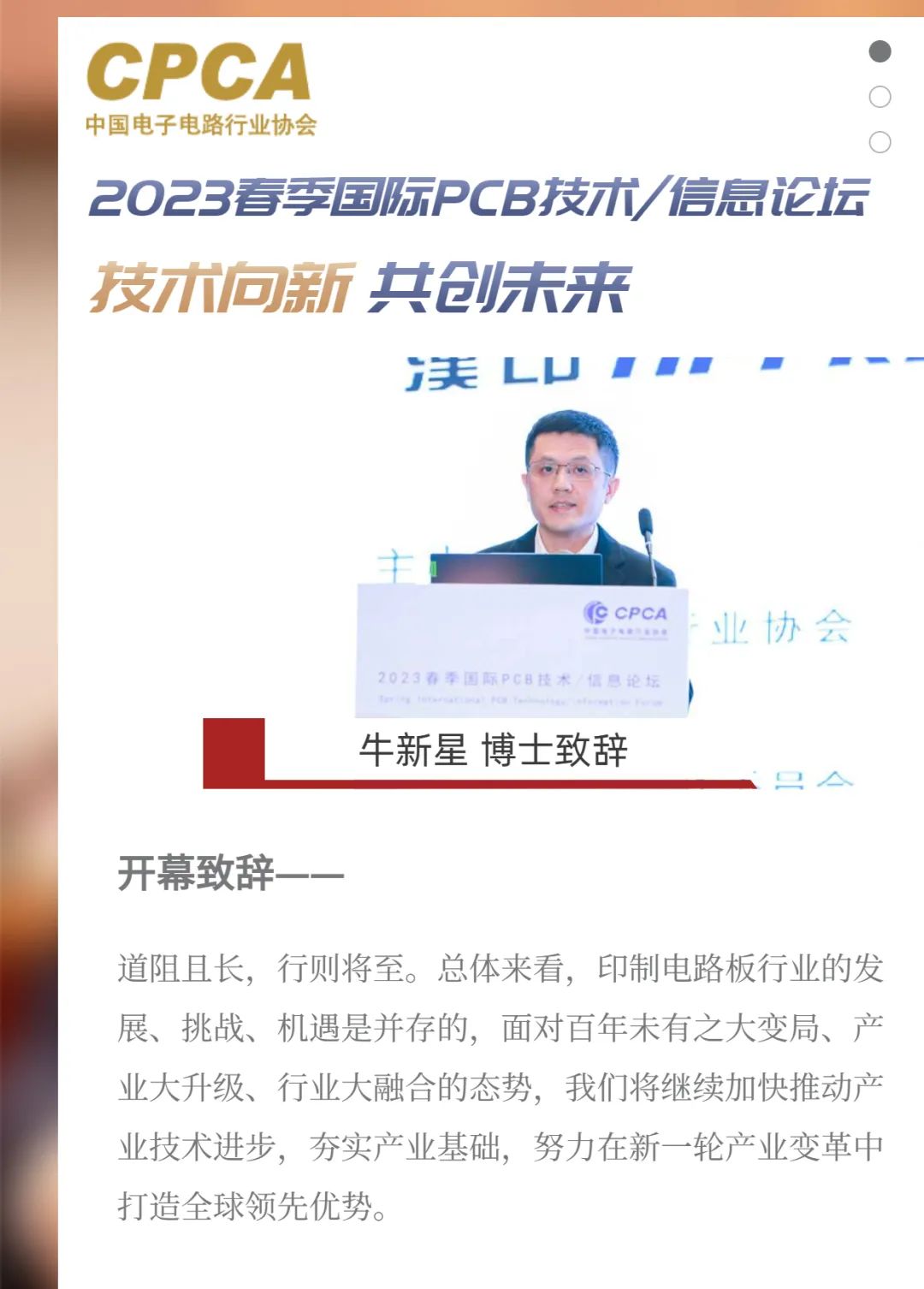 3月21日主旨论坛开幕式由CPCA监事长、CPCA科学技术工作委员会会长主持,CPCA理事长由镭代表主办方作开幕致辞并在主旨演讲中通过视频的方式做重要演讲。包括由理事长在内的共8位嘉宾在开幕式暨主旨论坛上就产业现状与趋势、热点技术方向、跨界思考新机遇等方面呈现了精彩的演讲。各位嘉宾的演讲内容紧扣主题、通过产业的现状看趋势、结合各自领域的需求链接电子电路产业,为产业的发展提供建议,值得回顾和反复学习。